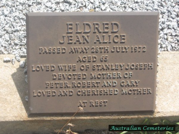 | ELDRED | Jean Alice | photo | 28/7/1972 | 65 | Stanley Joseph | mother to Peter,Robert,Gary | |