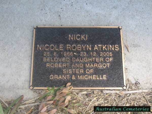 | ATKINS | Nicole Robyn (Nicki) | photo | 25/8/1966 | 23/12/2005 | par Robert & Margot,sis to Grant & Michelle | ||