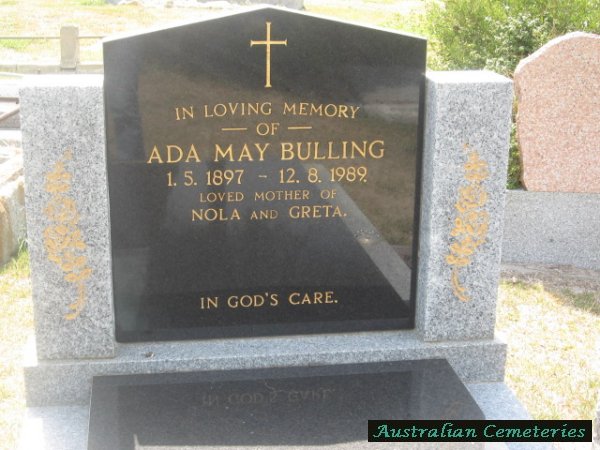 | BULLING | Ada May | photo | 1/5/1897 | 12/8/1989 | mother to Nola & Greta | ||