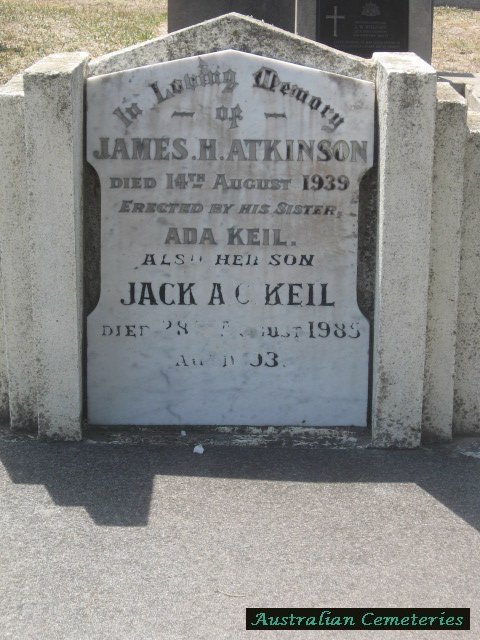 | ATKINSON | James H. | photo | 14/8/1939 | Erected by his sister Ada Keil ,buried with her son Jack Keil | |||