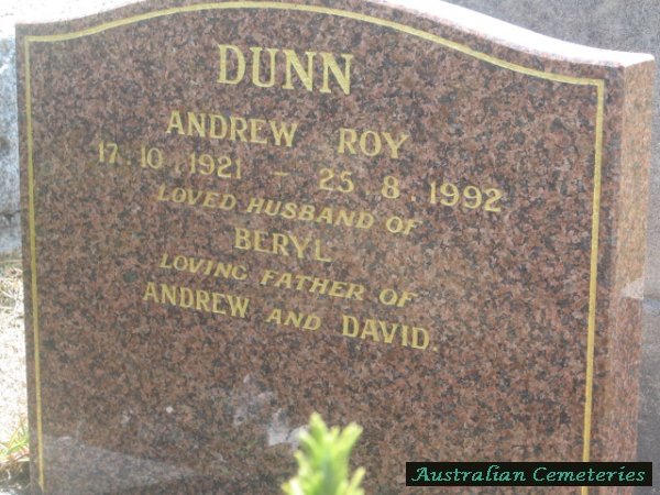 | DUNN | Andrew Roy | photo | 17/10/1921 | 25/8/1992 | Beryl | father to Andrew & David | |