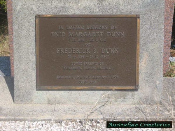 | DUNN | Enid Margaret | photo | 1/11/1898 | 25/9/1976 | Frederick S. | par Albert & Gertrude A Peate,mother to Elizabeth,Alison,Graham | |