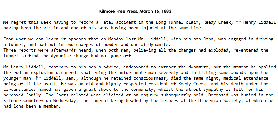 Cemetery Register incorrectly records a Mrs for this entry. The BDM has Henry LIDDLE dying in 1883 at Reedy Creek, Victoria, Australia, married to Bella UNKNOWN. See the linked photo of the Kilmore Free Press of March 15, 1883. |