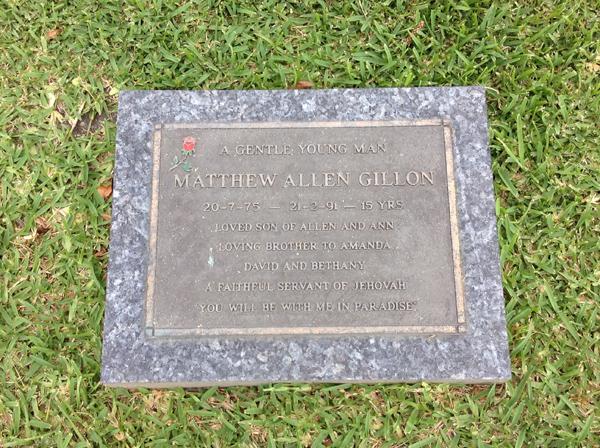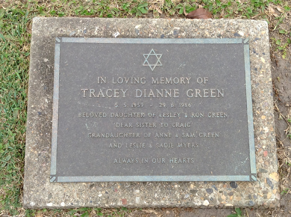 | Green | Tracey Dianne | photo | 5/05/1959 | 29/06/1986 | d/o Lesley & Ron Green, s/o Craig, G/d of Anne & Sam Green & Leslie & Sadie Myers | ||