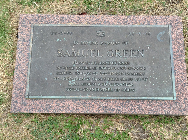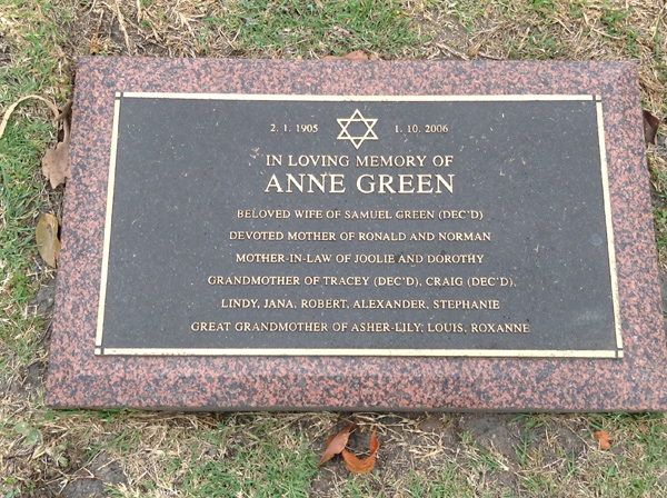 | Green | Anne | photo | 2/01/1905 | 1/10/2006 | w/o Samuel Green (Dec.), m/o Ronald & Norman, mother-in-law of Joolie & Dorothy | ||