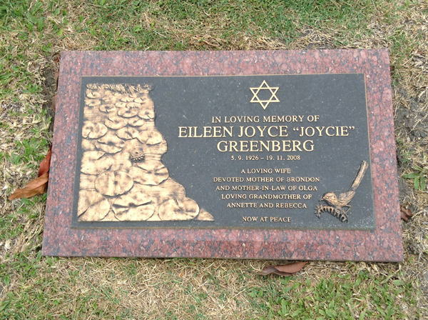 | Greenberg | Eileen Joyce (Joycie) | photo | 5/09/1926 | 19/11/2008 | m/o Brondon, mother-in-law of Olga, G/m of Annette & Rebecca | ||