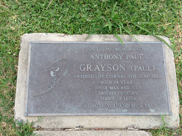 | Grayson | Anthony Paul | photo | 5/06/1992 | 24 | s/o Max & Judy, brother of Susan, Fiance of Leesa | ||