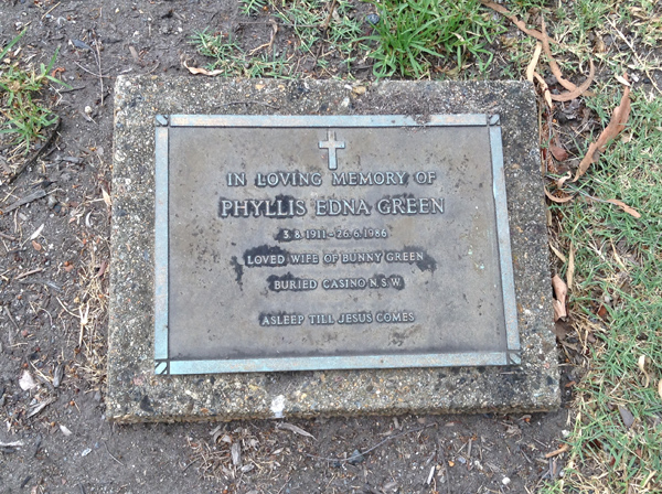 | Green | Phyllis Edna | photo | 3/08/1911 | 26/06/1986 | w/o Bunny Green | ||