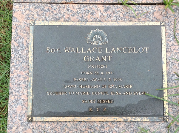 | Grant | Wallace Lancelot | photo | 25/08/1916 | 5/02/1998 | NX135261 Sgt, h/o Ena Marie, b/o Marie, Eunice, Elsa & Sylvia | ||