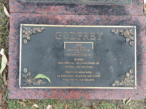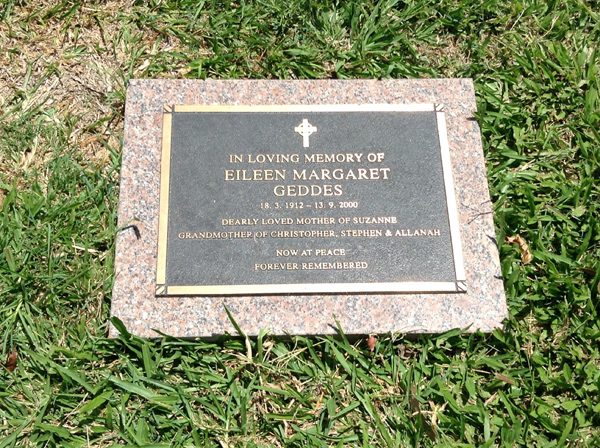| Geddes | Eileen Margaret | photo | 18/03/1912 | 13/09/2000 | m/o Suzanne, G/m of Christopher, Stephen & Allanah | ||