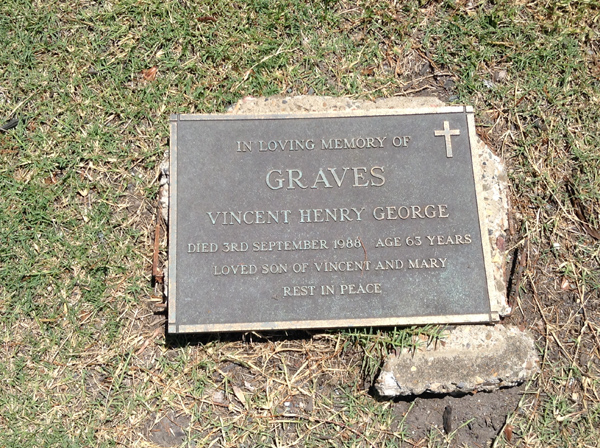 | Graves | Vincent Henry George | photo | 3/09/1988 | 63 | s/o Vincent & Mary | ||
