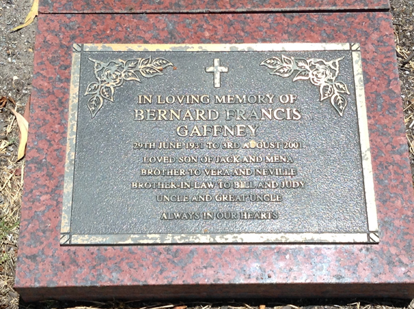 | Gaffney | Bernard Francis | photo | 29/06/1931 | 3/08/2001 | s/o Jack & Mena, b/o Vera & Neville, brother-in-law to Bill & Judy | ||