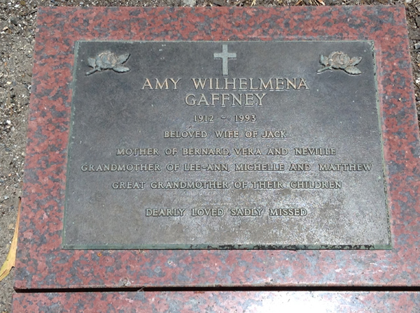 | Gaffney | Amy Wilhelmena | photo | 1912y | 1993y | m/o Bernard, Vera & Neville, G/m of Lee-Ann, Michelle & Matthew | ||