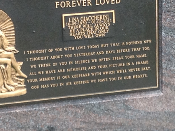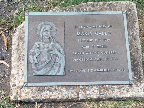 | Gallo | Maria | photo | 2/10/1989 | 76 | w/o Guiseppe, m/o Ilio | ||
