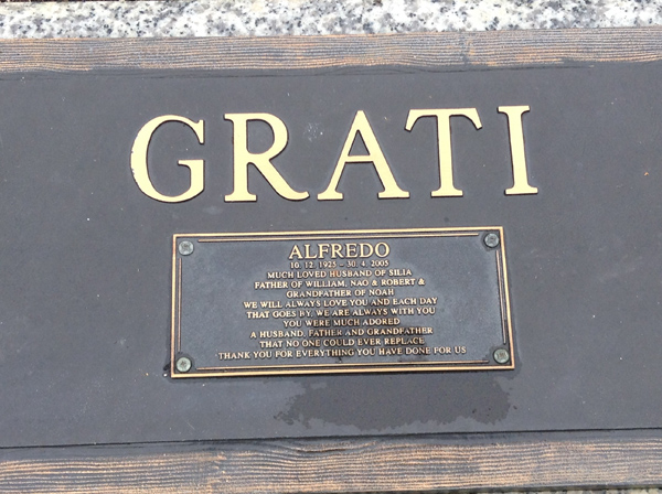 | Grati | Alfredo | photo | 10/12/1925 | 30/04/2005 | h/o Silia, f/o William, Nao & Robert & G/f of Noah | ||