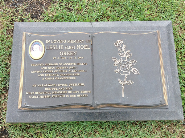 | Green | Leslie (Les) Noel | photo | 29/03/1928 | 10/11/2006 | h/o Annette Helene & Joan Roberta (Dec.), f/o Chris, Allen (Dec.) & Bethany | ||