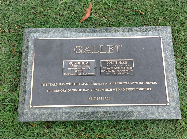 | Gallet | Odette Marie | photo | 14/07/1919 | 8/10/2010 | w/o Roger | ||