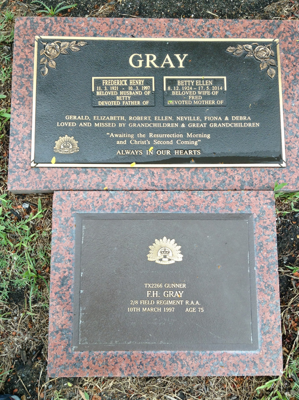 | Gray | Frederick Henry | photo | 11/03/1921 | 10/03/1997 | 75 | TX2266 Gunner, 2/8 Field Regiment RAA, h/o Betty, f/o Gerald, Elizabeth, Robert, Ellen, Neville, Fiona & Debra | |