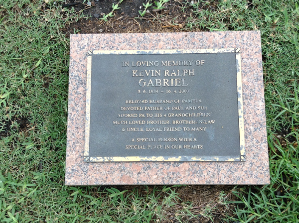 | Gabriel | Kevin Ralph | photo | 5/06/1934 | 16/04/2000 | h/o Pamela, f/o Paul & Sue | ||
