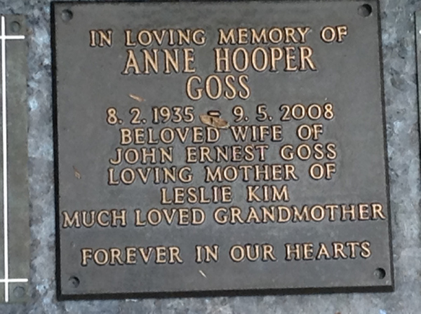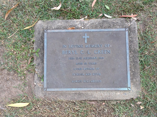 | Green | Beryl C L | photo | 17/02/1989 | w/o Graham, m/o Stephen & Amanda, Nu-Nu & Pa of Daniel, Josh, Jesse, Lhiana & Ethan | |||