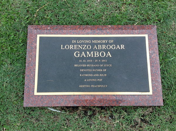 | Gamboa | Lorenzo Abrogar | photo | 11/11/1918 | 25/09/2012 | h/o Joyce, f/o Raymond & Julie | ||