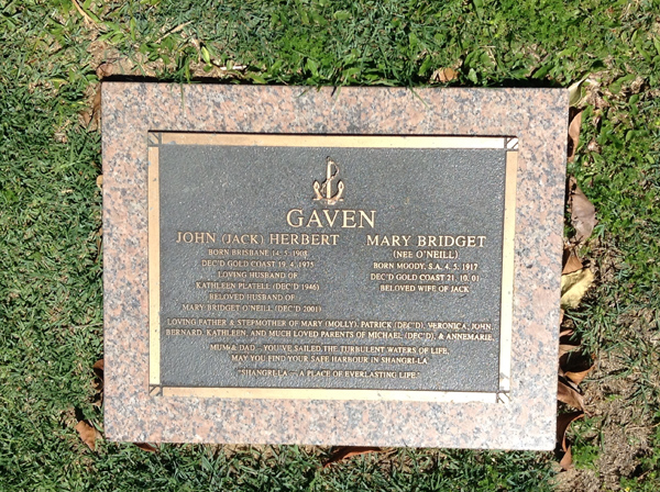 | Gaven | John (Jack) Herbert | photo | 14/05/1908 | 19/04/1975 | H/o Kathleen Platell (Dec.1946) & Mary Bridge O'Neill (Dec. 2001) | ||
