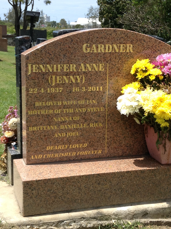 | Gardner | Jennifer Anne (Jenny) | photo | 22/04/1937 | 16/03/2011 | W/o Ian m/o Tim & Steve GM/o Brittany, Danielle, Rick & Joel | ||