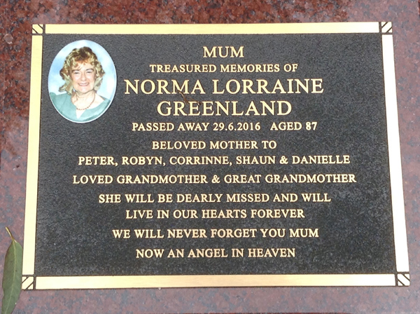 | Greenland | Norma Lorraine | photo | 29/06/2016 | 87 | M/o Peter, Robyn, Corrinne, Shaun & Danielle | ||