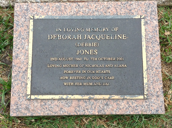 | Jones | Deborah Jacqueline (Debbie) | photo | 2/08/1960 | 7/10/2001 | m/o Nicholas & Alana | ||