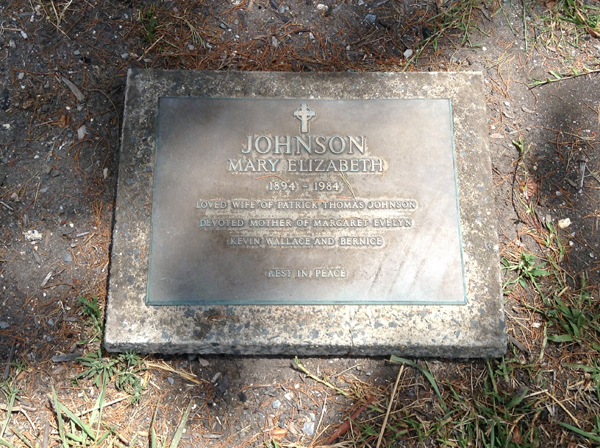 | Johnson | Mary Elizabeth | photo | 1894y | 1984y | w/o Patrick Thomas Johnson, m/o Margaret Evelyn | ||