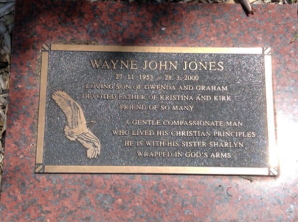 | Jones | Wayne John | photo | 27/11/1953 | 28/03/2000 | s/o Gwenda & Graham, f/o Kristina & Kirk | ||