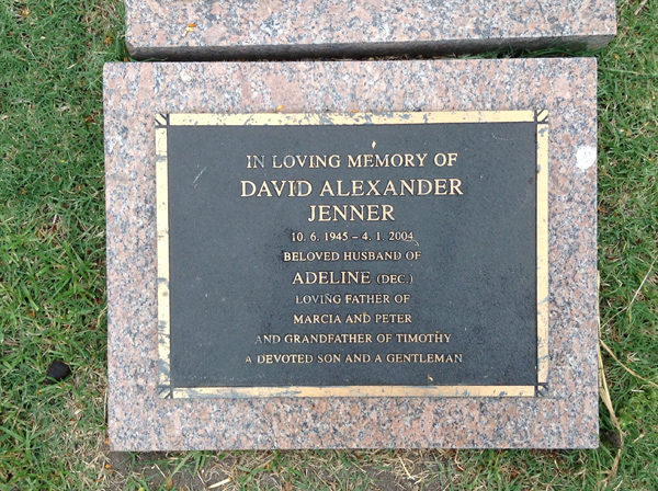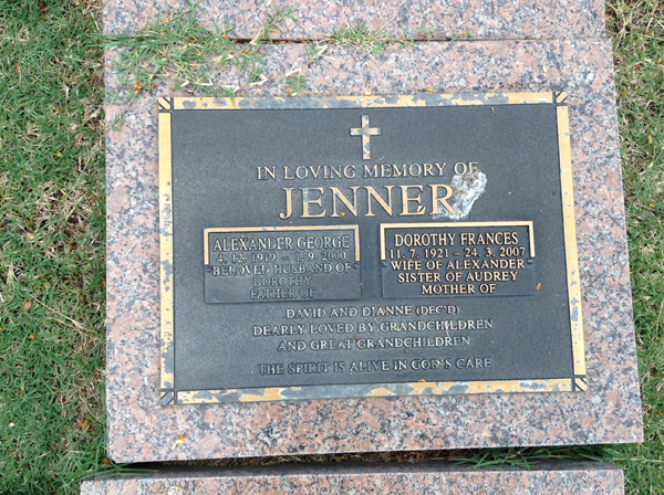 | Jenner | Dorothy Frances | photo | 11/07/1921 | 24/03/2007 | w/o Alexander, sister of Audrey, m/o David & Dianne (Dec'd) | ||