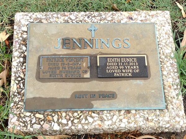 | Jennings | Edith Eunice | photo | 21/11/2013 | 99 | w/o Patrick | ||