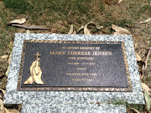 | Jensen | Mary Therese | photo | 18/08/1920 | 27/10/2013 | 93 | nee Bowdler | |