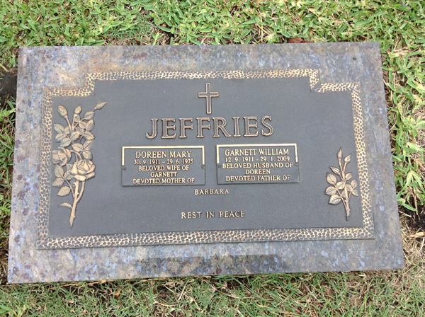 | Jeffries | Doreen Mary | photo | 30/09/1911 | 29/06/1975 | w/o Garnett, m/o Barbara | ||