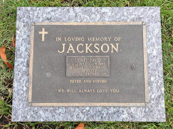 | Jackson | Lionel David | photo | 14/12/1937 | 11/06/1995 | h/o Joyce, f/o Peter & Steven | ||