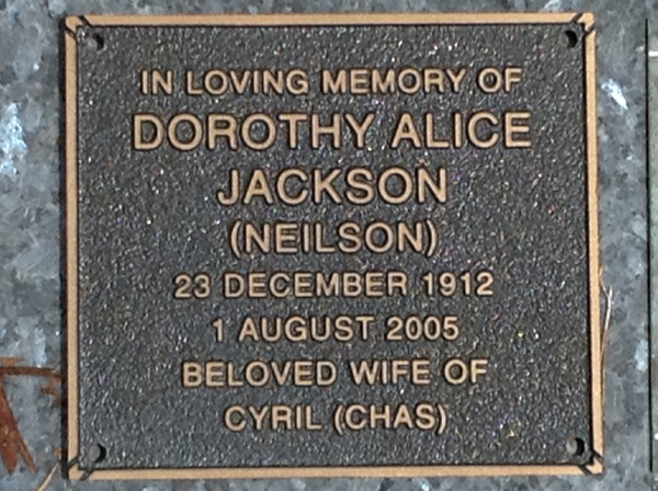 | Jackson | Dorothy Alice (Neilson) | photo | 23/12/1912 | 1/08/2005 | w/o Cyril (Chas) | ||