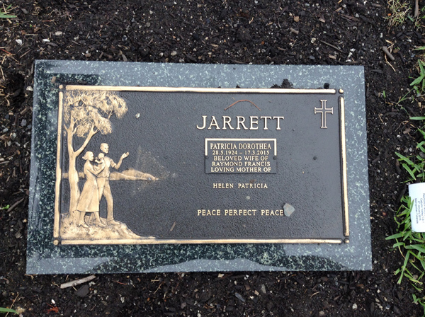| Jarrett | Patricia Dorothea | photo | 28/05/1924 | 17/03/2015 | w/o Raymond Francis, m/o Helen & Patricia | ||