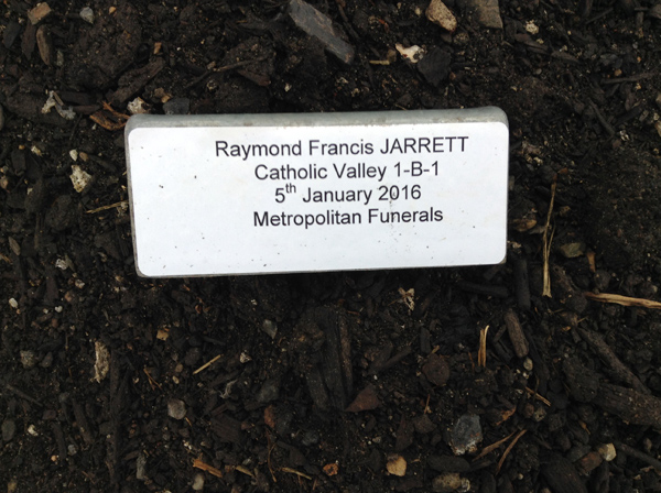 | Jarrett | Raymond Francis | photo | 5/01/2016 | Catholic Valley 1-B-1, Metropolitan Funerals | |||