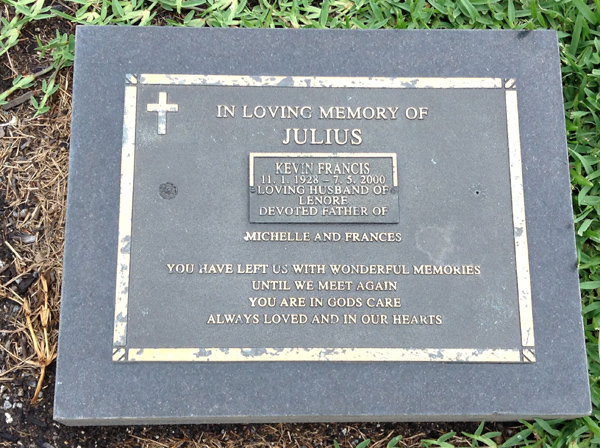 | Julius | Kevin Francis | photo | 11/01/1928 | 7/05/2000 | h/o Lenore, f/o Michelle & Frances | ||