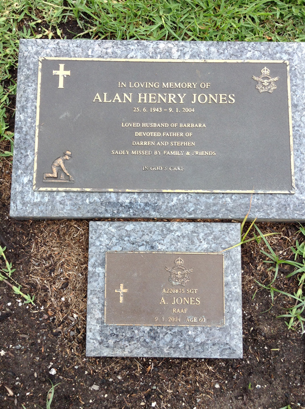 | Jones | Alan Henry | photo | 25/06/1943 | 9/01/2004 | 60 | A220875 Sgt, RAAF, h/o Barbara, f/o Darren & Stephen | |