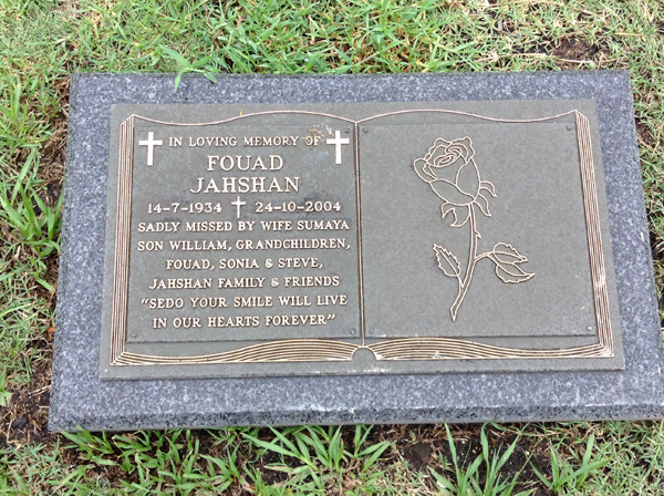 | Jahshan | Fouad | photo | 14/07/1934 | 24/10/2004 | h/o Sumaya, f/o William, G/f of Fouad, Sonia & Steve | ||