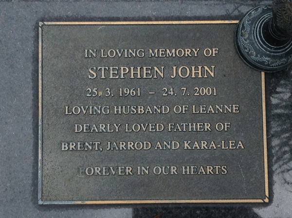 | John | Stephen | photo | 25/03/1961 | 24/07/2001 | H/o Leanne, f/o Brent, Jarrod & Kara-Lea | ||