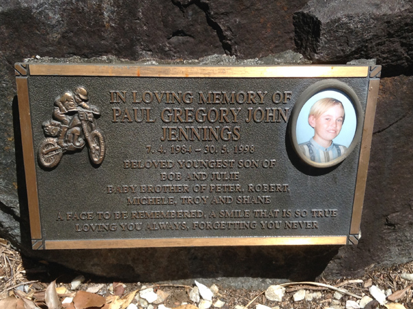 | Jennings | Paul Gregory John | photo | 7/04/1984 | 30/05/1998 | S/o Rob & Julie, b/o Peter, Robert, Michele, Troy & Shane | ||