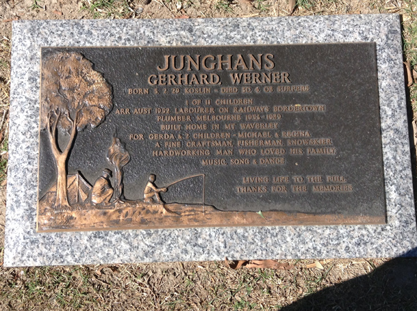 | Junghans | Gerhard Werner | photo | 5/02/1929 | 30/04/2008 | f/o Renay, Kate & Nathan, s/o Con & Narnie, b/o Steve & Jen | ||
