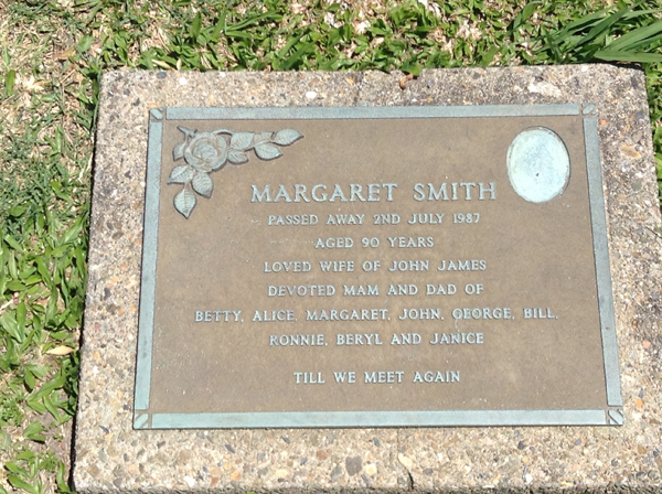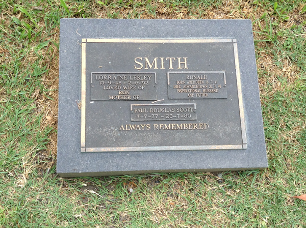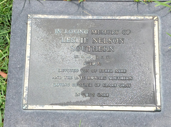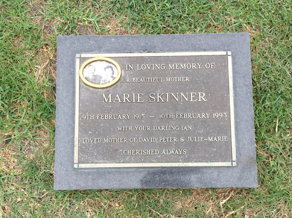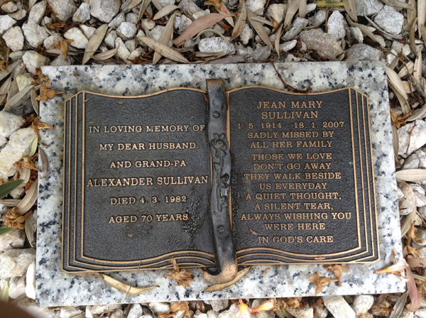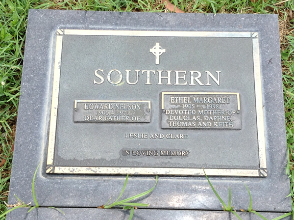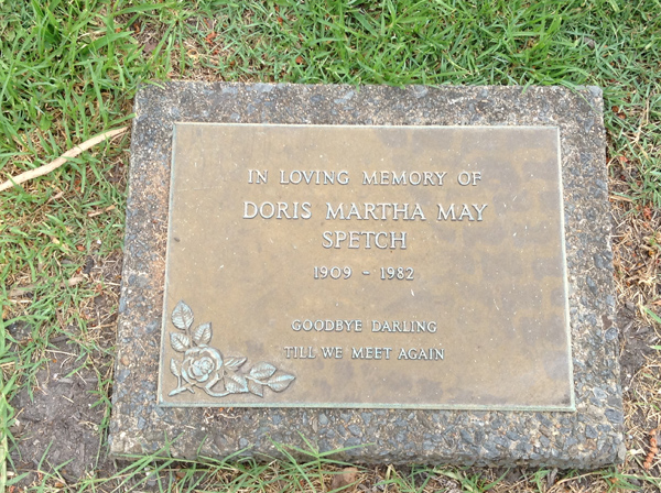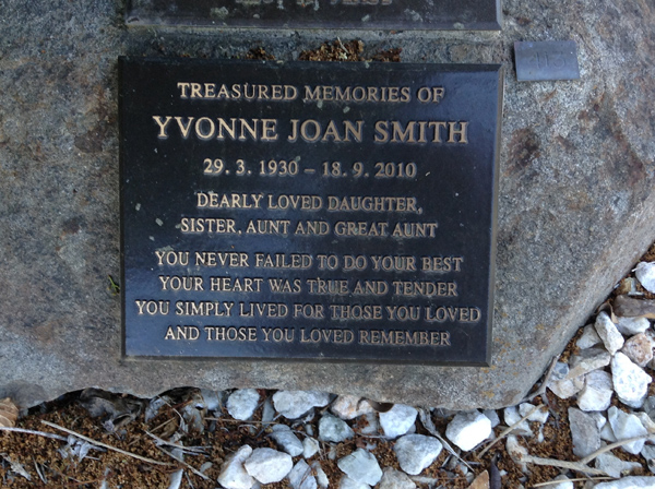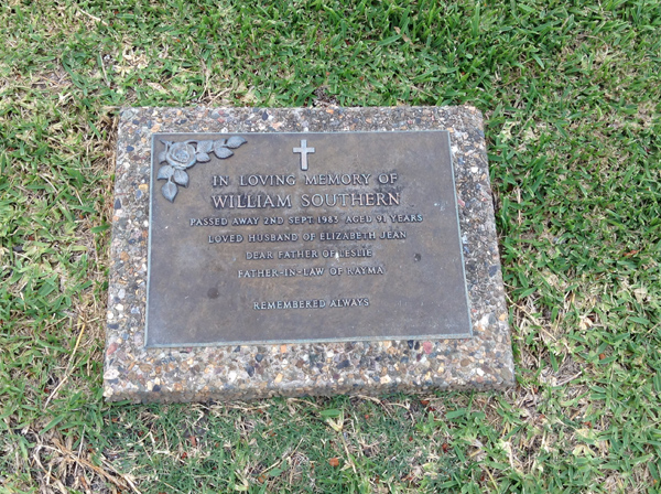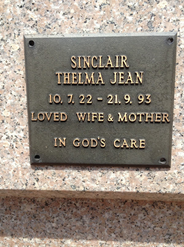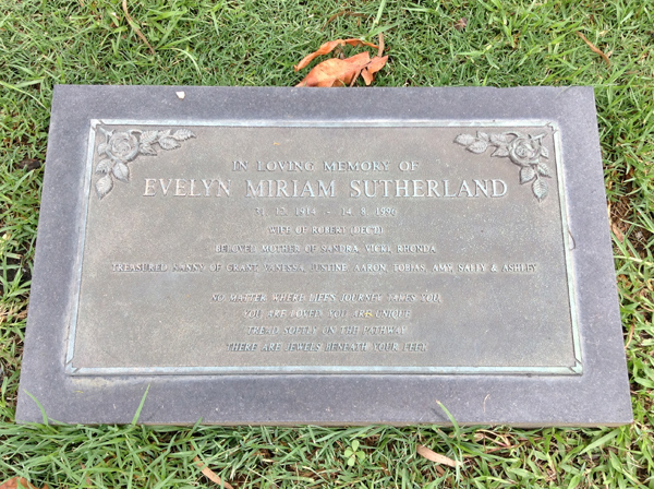 | Sutherland | Evelyn Miriam | photo | 3813 | 31/12/1914 | 14/08/1996 | w/o Robert (Dec.), m/o Sandra, Vicki, Rhonda, Nanny of Grant, Vanessa, Justine, Aaron, Tobias, Amy, Sally & Ashley | ||