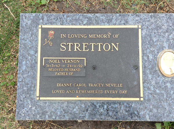 | Stretton | Noel Vernon | photo | 1522 | 31/03/1942 | 24/11/1992 | Husband, father of Dianne, Carol, Tracey & Neville | ||