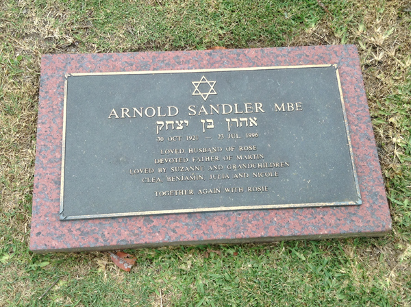 | Sandler MBE | Arnold | photo | 1839 | 30/10/1921 | 23/07/1996 | h/o Rose, f/o Martin, loved by Suzanne & G/f of Clea, Benjamin, Julia & Nicole | ||