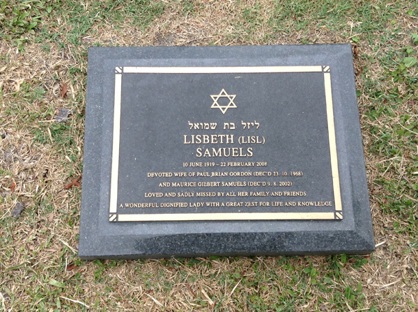 | Samuels | Lisbeth (Lisl) | photo | 1874 | 10/06/1919 | 22/02/2008 | w/o Paul Brian Gordon (Dec'd) 23 Oct 1968 & Maurice Gillbert Samuels (Dec'd) 9 Aug 2002 | ||