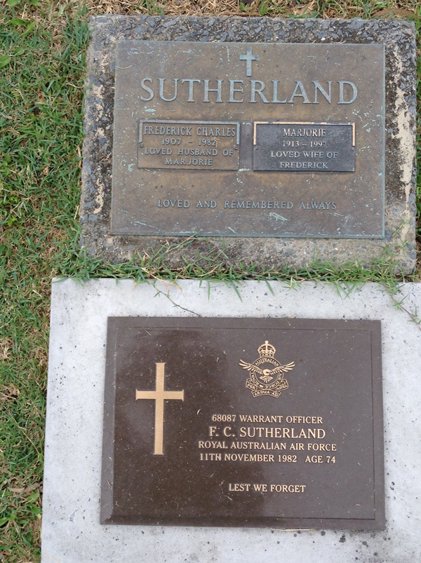 | Sutherland | Frederick Charles | photo | 1411 | 1907y | 11/11/1982 | 74 | 68087 Warrant Officer, RAAF, h/o Marjorie | |